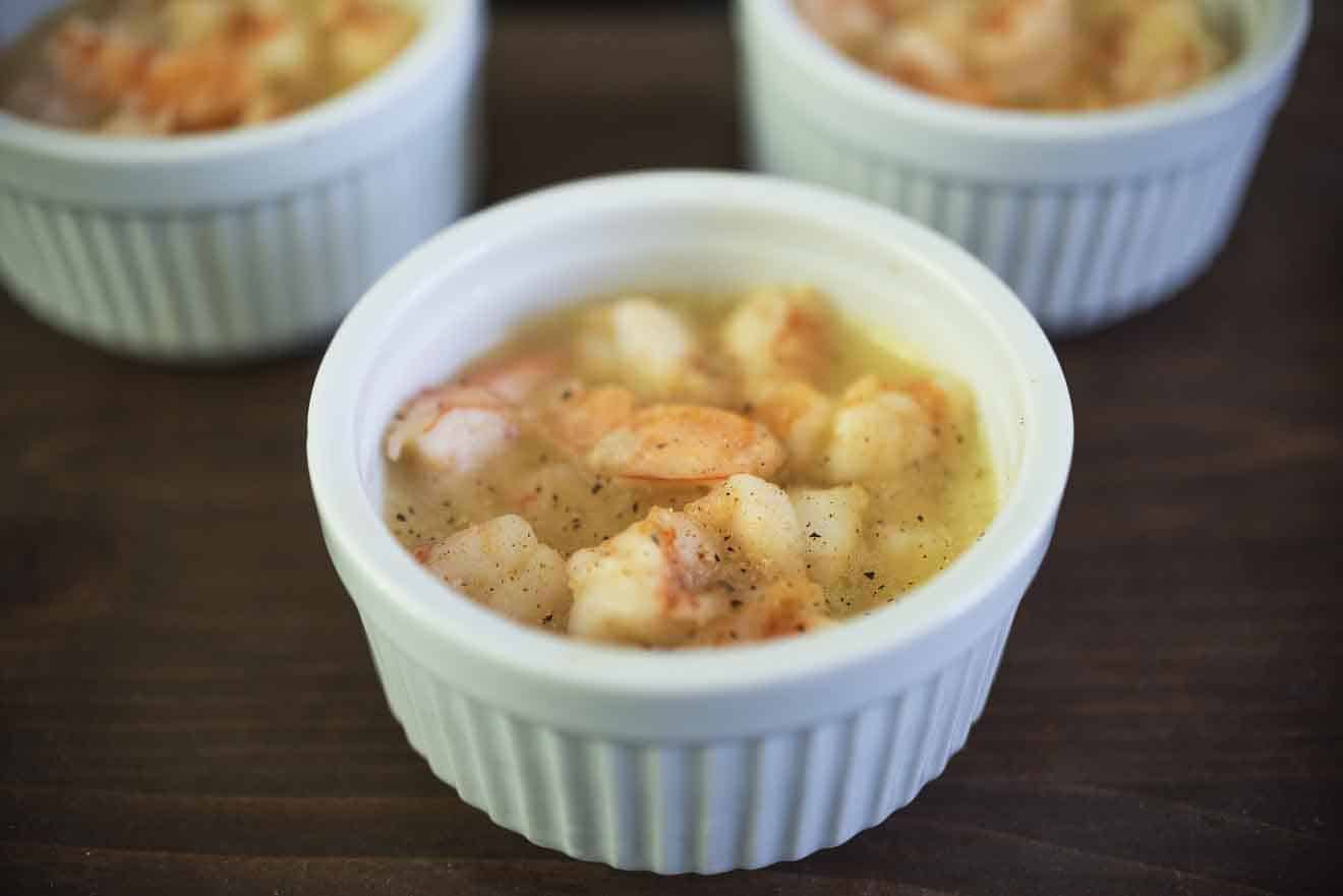 - Use a slotted spoon to transfer the shrimp to 4 small ramekins/bowls. Pour the butter over them.